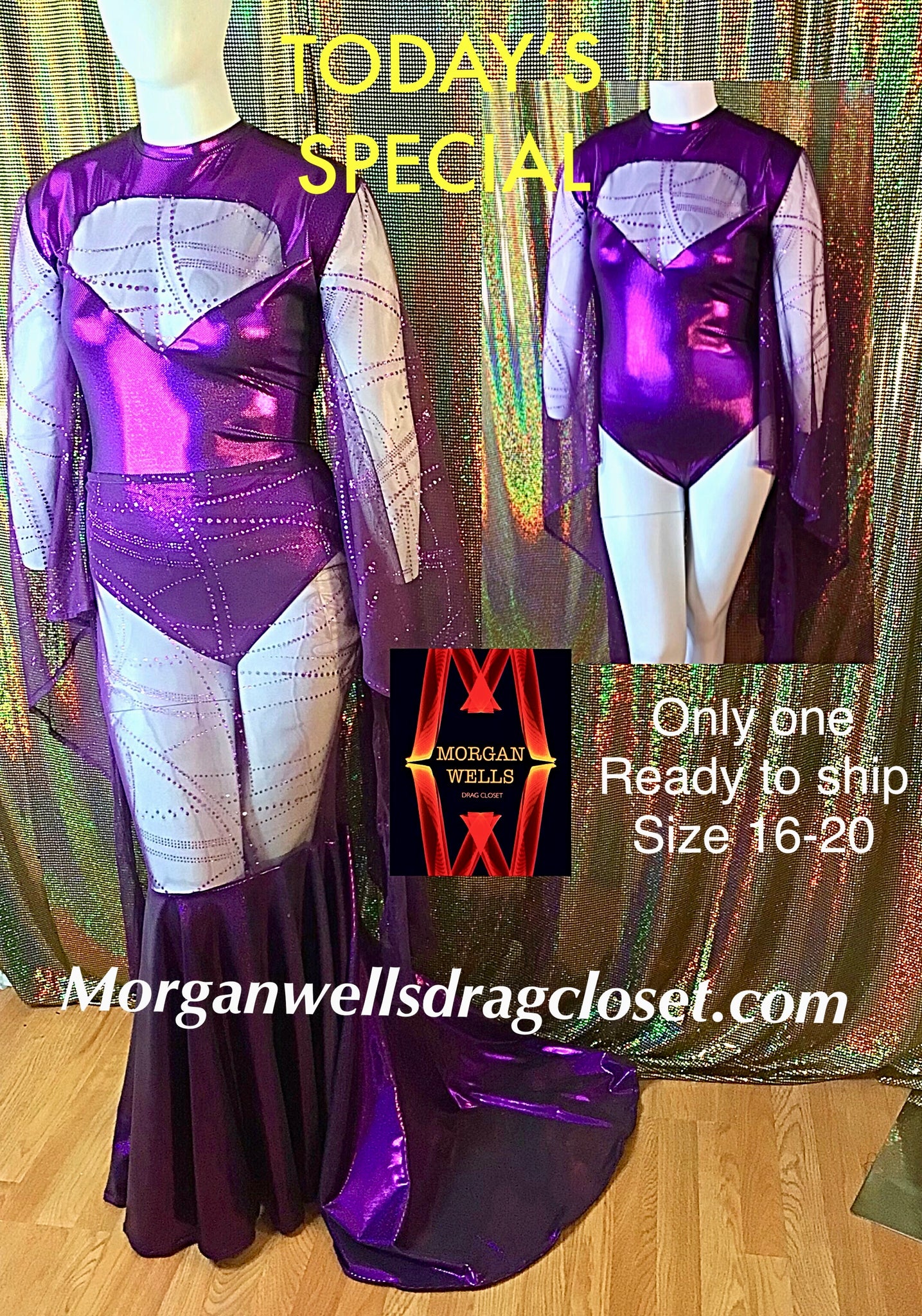 This MORGAN WELLS leotard, and matching flounce skirt is made of a pruple foil spandex. It has sheer sleeves with purple sparkle. It comes with a matching skirt that is made of the sheer with the spandex at the bottom. The leotard has an invisible zipper up the back.